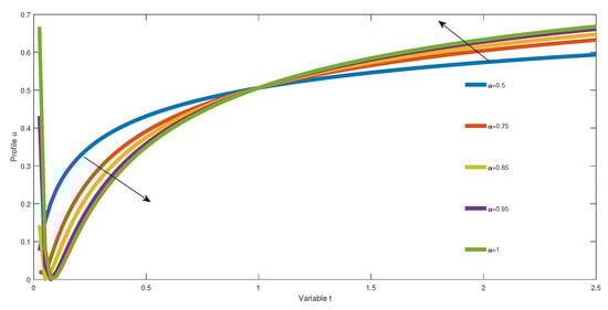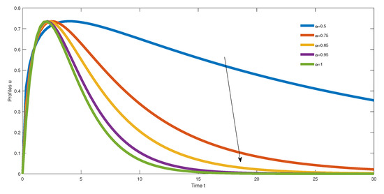 Figure 4, we depict the profiles with different orders; we observe all the profiles decrease in time and converge rapidly to zero. The form of the reaction does not have many impacts on the nature of the diffusion process; that is, we note the same behavior as in the subdiffusion process studied in the previous case. The subdiffusion process explains the decrease of all the analytical solutions. In other words, the increase in the order accelerates the diffusion process.
