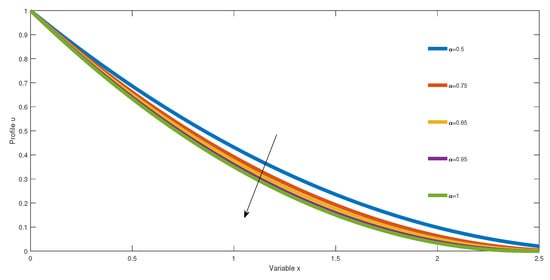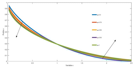 We note, in this case, when the fractional order of the truncated Grunwald–Letnikov fractional derivative increase, we notice the profiles converge rapidly to zero, see the direction of the arrow for more details.