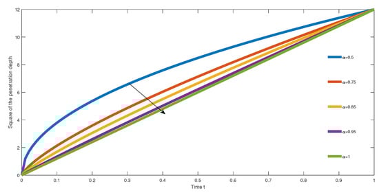 Figure 5, we represent the square of the penetration depth for different values of the fractional order. We notice when the order increases, the square of the penetration depth becomes linear. In other words, the penetration depth of the fractional model converges to the penetration depth of the classical diffusion equation obtained with a classical derivative.