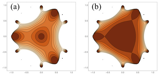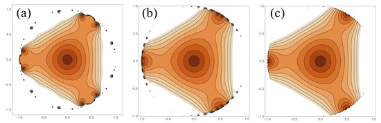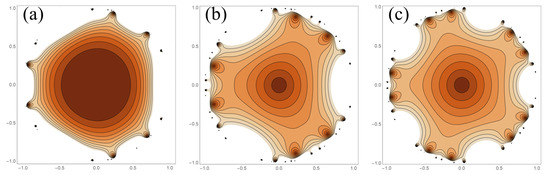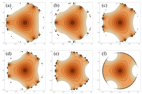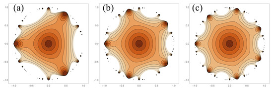 39]. The modulus of centered polygonal lacunary functions exhibits rotational symmetry under a phase shift in the complex plane. This is related to the fact that lacunary functions also exhibit well organized behavior at the natural boundary [