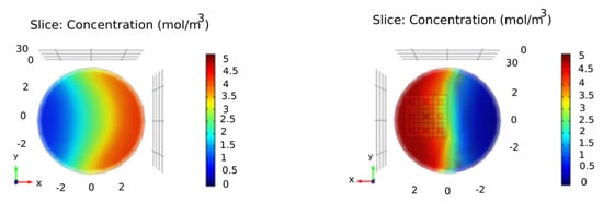 In this case, we select and simulate the above parameters’ values so that we have Reynolds numbers in the laminar flow range. For a laminar flow, the number is Reynolds ().