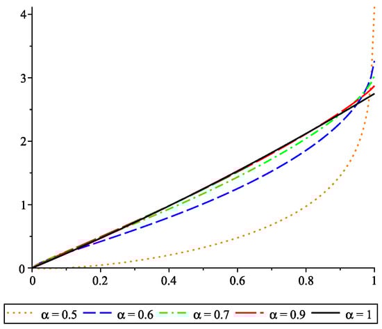 is the only candidate to be a local extremizer of functional , and, since  is jointly convex,  is the global minimizer. Solving the fractional problem analytically is very difficult, and thus a numerical technique is applied. In Figure 1, we show the results. Four different fractional orders are considered, and, as can be observed, the solution converges to  as α goes to one.