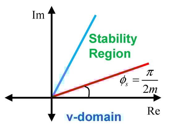 Roots of the expanded degree integer order characteristic polynomials are calculated, and only the roots that lie in the first Riemann sheet are evaluated for stability analysis [11,12,13,14,16,29]. The rest of the roots, which are not in the first Riemann sheet, are assumed not to be meaningful for system stability. The first Riemann sheet is a portion of the complex plane that is confined within an argument range of [11,29]. The first Riemann sheet splits into two sections that are stable and unstable root regions by the stability line with the angle of . Since the first Riemann sheet is symmetrical with respect to the real axis in the complex plane, one can perform stability analysis in the positive angle side of the first Riemann sheet that is in the angle range of . As a consequence, a fractional order system model is said to be stable when all characteristic roots lie in the range of . Figure 1 depicts the stability region in the v-plane.