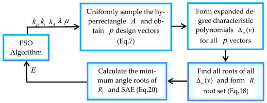 Specifying the minimum target angle in the range of ensures the placement of the minimum angle root within the stability region of the v-plane, and thus stabilizes the resulting FOPID control system according to a target angle . The can be configured to obtain improved robust control performance. This optimization problem is solved by using the PSO method according to the flow chart in Figure 3, and the results are discussed in the following section.