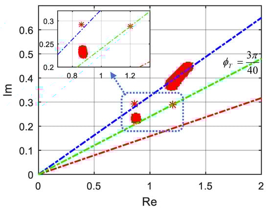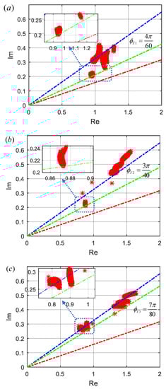 Figure 10a–c show the placements of all roots of characteristic polynomials from the interval uncertainty box (characteristic roots are indicated by red asterisks and dots). The figures reveal that the minimum argument root of the interval system was placed on the specified target angles and all FOPID designs can optimally stabilize the system by placing the minimum angle root on the target angles.