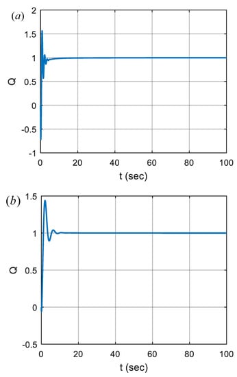In order to evaluate disturbance rejection performances of the robust stabilized FOPID control system designs for the target angle specifications , and , step disturbance responses of the systems are shown in Figure 13. In these control systems, a set-point prefilter function was used to overcome overshoots, and it improves settling to the step input before applying the additive step disturbance to the input of the plant function. The figure indicates satisfactory disturbance rejection performances of the optimally stabilized robust FOPID controllers in this example.