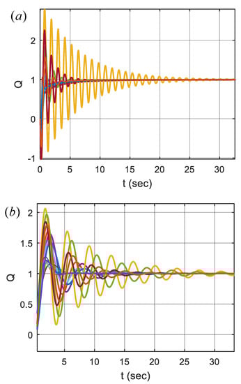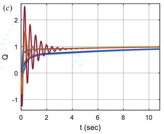 Figure 12 shows the step responses of 16 vertex functions of the uncertainty box. For the target angle specification , step performances of the control system for the vertex functions are more similar than the results of other target angle specifications. This indicates that the FOPID controller for is more robust than other FOPID designs due to less variability among step responses that were obtained for the vertex plant functions. Therefore, we observed in this example that the control performance of can be more robust than other target angle specifications against parametric perturbation of the plant function. The FOPID controller design for can be more suitable for real control applications.