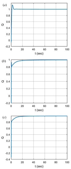 Step responses of stabilized FOPID control systems for target angle specifications (a) for , (b) for and (c) for .