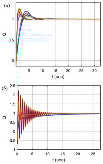 In Figure 12b,c, the variability of control performance is higher between vertices of the interval box, and it indicates more deterioration of the control performance while parameters are changing inside the interval box. The step response MSE performances in Table 4 and Table 5 validate these effects.