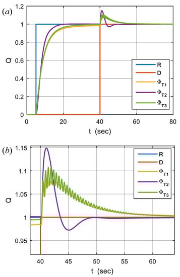 Step disturbance responses of FOPID controller designs for the target angle specifications , and ; (a) a full view from simulation and (b) a close view of disturbance responses.