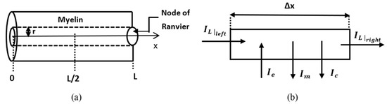 Myelination of neurons is a critical growth process taking place during the first two years of life, which facilitates the fast transmission of information throughout the body. The process involves the wrapping of the neuronal axons by myelin sheaths made of multiple layers of glial plasma membrane. The myelinated regions are separated by the nodes of Ranvier (Figure 1). Some specialized glial cells called oligodendrocytes produce myelin and create the neuro–glial-controlled clustering of voltage-gated sodium channels at the nodes of Ranvier and the aggregation of fast voltage-gated potassium channels in the myelin sheath [1,2]. The existence of some slow potassium channels in the nodes of Ranvier was reported in [3]. Experiments performed in cell cultures and in vivo reveal that nodal-like groups are created just before the myelination starts [4]. This indicates that myelination is highly dependent on timing and neuronal surroundings, especially the amounts of certain chemicals and water. An impediment to the myelination process or damage to the myelin sheath, which may or may not lead to demyelination, could cause serious, possibly life-threatening, neurologic disorders. For instance, multiple sclerosis is the most common demyelinating disorder affecting young adults that currently has no cure [5]. Mathematical models can provide essential insights into myelination/demyelination processes that can further inspire better diagnostic and therapeutic procedures for various neurological disorders.