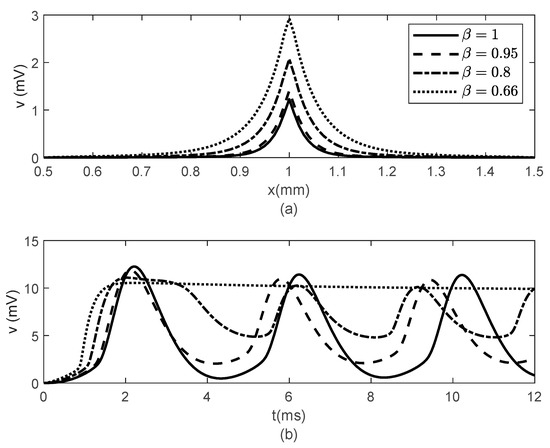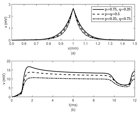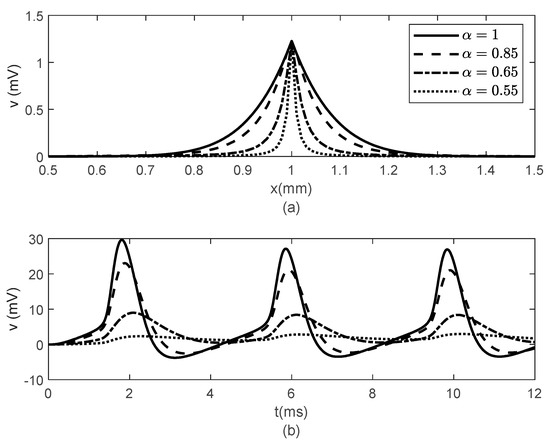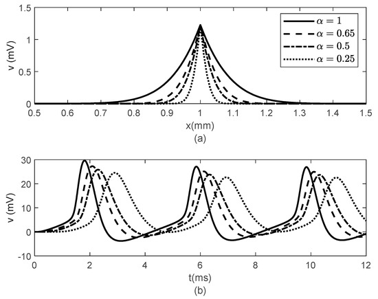 Figure 6 and Figure 7 show the results obtained for , and various values of . While the width of the action potentials at the node of Ranvier and at the fixed time barely changes with decreasing (increasing ) (Figure 6a), the amplitude of the potential at fixed location decreases as decreases ( increases) (Figure 6b). The long-term memory represented by causes delays in the opening and closing of the ion channels, which can be seen in the time variations of the gating variables and (Figure 7), which further produce the delay in the membrane potential seen in Figure 6b. Again, the values of and do not influence the variations in and (Figure 7).