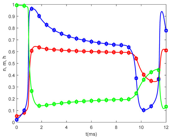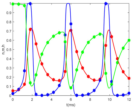 Time variations of the gating variables (red), blue), and (green), obtained by solving the fractional Hodgkin–Huxley Equations (35)–(38) for Here, and (square symbol); (diamond symbol); and (circle symbol).