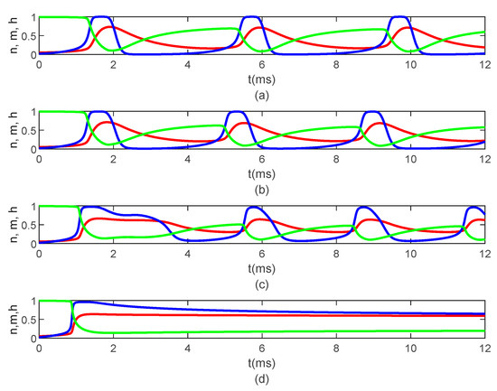Time variations of the gating variables (red), blue), and (green), obtained by solving the fractional Hodgkin–Huxley Equations (35)–(38) for (a) , (b) , (c) , and (d) Here, and .