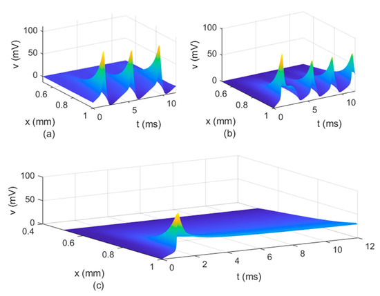 Figure 8, Figure 9 and Figure 10 show the variations in and for , , and various values of The same results are obtained for . Thus, Figure 6, Figure 7, Figure 8, Figure 9 and Figure 10 suggest that the bidirectional propagation has little to no effect on the shapes of the action potentials at the nodes of Ranvier. At the fixed time , the amplitude of the action potential at the node of Ranvier increases as the long-term memory increases (corresponding to decreasing) and its shape becomes wider (Figure 8a), while at fixed location the potentials flatten with decreasing (Figure 8b). As the long-term memory increases, the delay in the opening and closing of the ion channels increases (Figure 9a–c) until they stop operating at (Figure 9d). Figure 8b shows that the potential reaches a steady state value at . The spatio-temporal variations of in Figure 10 show how possible defects in the membrane potentials start to develop as decreases. The increasing delay in the action potentials at the node of Ranvier with decreasing (Figure 10b) looks like the shapes of the membrane potentials observed experimentally in transgenic Nav1.8-null knockout DRG neurons ([21], Figures 8b and 9c). Abnormal Nav1.8 expression in some neurons may be linked to multiple sclerosis in humans [22]. Mutations of some sodium channels can cause persistent sodium currents that, combined with the blockade of potassium and calcium currents, lead to prolonged plateau potentials in the neurons of mice [25] (also [24], Figure 1B). These potentials resemble the ones in Figure 10b. According to [24], persistent sodium currents are linked to epilepsy. The same shape of the membrane potential shown in Figure 10b was also observed experimentally in neurons under spreading depolarization (SD) and a blockade of astrocytic glutamate transporters ([26], Figure 8a–c). SD occurs in traumatic brain injuries and ischemic stroke. Lastly, cerebral anoxic depolarization that happen during a stroke or brain ischemia causes a potential like the one in Figure 10c [23]. Without immediate treatment, this condition leads to brain death. Therefore, there is no physiological justification to further decrease the value of . Nevertheless, it was observed that the solution becomes unstable for
