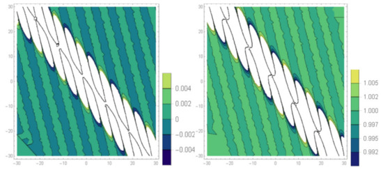 The strain condition is also given as . We can observe the wave surfaces of Equation (18) as being in Figure 3 and Figure 4.