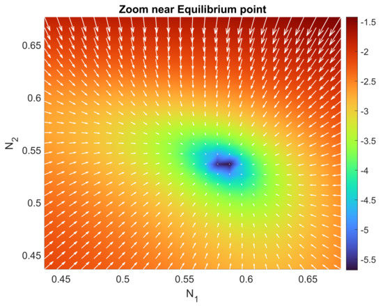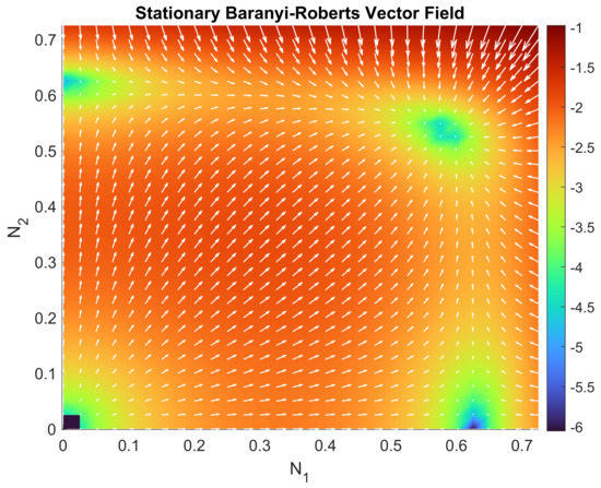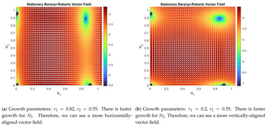 has three trivial solutions, and . But there is another one in the interior of D, which can be found through a numerical root finder. Figure 1 and Figure 2 show the vector field and how the parameters affect the dynamics of the system.