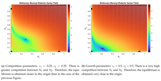 Comparison of the flow function and its log-magnitude, , given by the Baranyi–Roberts system (9) and (10) with the set of parameters described in each figure, and in both figures. In darker color, the four equilibrium points that are given by the solutions of the nonlinear system (11) and (12).