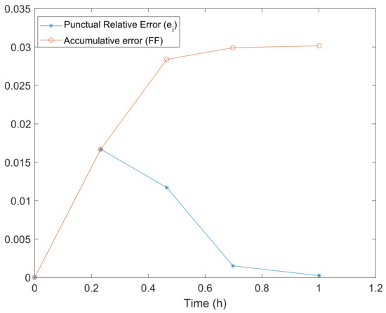 - Once the means for have been computed, which is and , we obtain the total error, denoted by , where each summand is the relative error between the aforementioned means and the sample data, and , as shown in Table 1,where