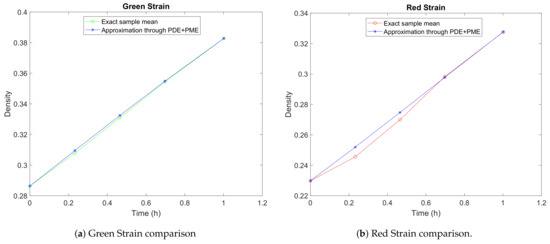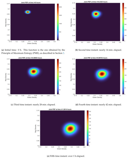 Figure 3 shows the punctual and accumulative errors defined, respectively, by and defined in expressions (22) and (21). We observe that the relative error decreases as time goes on. Figure 4 and Figure 5 show the vector field for the parameters in Table 3. In Figure 6a,b, we have performed a graphical comparison between the sampled data and the approximation obtained by our stochastic model for both Green and Red Strains. Both of the plots provide evidence of a very good fitting. Furthermore, the time evolution of the joint PDF of the solution stochastic process can be seen in Figure 7a–e. However, the maximum height of the joint PDF decreases very rapidly (observe the magnitude of the lateral colored bar), which means that the variance of the solution increases from diffusion, probably due to the DCU numerical scheme’s nature, as it can be seen in Figure 7a–e.