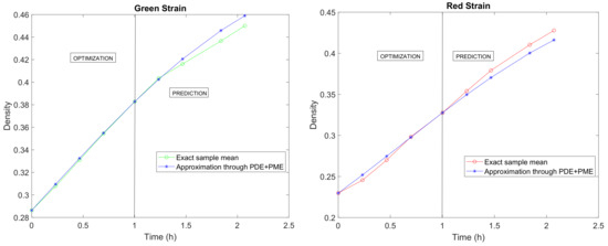 Predicting or extrapolating the dynamics of complex and highly parameterizable systems with randomness is a very difficult task. In our model setting, and after the previous validation process, we are interested in predicting the volumetric density of both strains of bacteria, since such future projections allow for the control of the biological culture. In Figure 8a,b, we show the predictions for Green and Red Strains over the time instants , , , and h. Comparing these figures with the ones that were collected in [28] (Experiment B), we observe that the stochastic model is able to capture the dynamics of volumetric density for the two strains of bacteria. This result has been obtained by only considering randomness in the initial conditions and adjusting the model parameters and .
