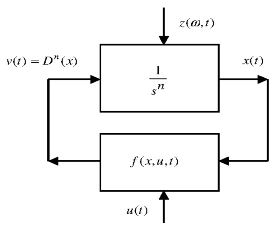 An alternative to the modeling of fractional systems is based on the diffusive representation [20,21] or the frequency distributed representation [22,23]. The internal state of the fractional integrator, which is the basic element for system modeling, is defined by the relation . This relation expresses that the pseudo-state variable depends on the infinite dimensional distributed state variable . It has been proved that the initial state permits the prediction of for [24]; moreover, it has been proved that this modeling technique, known as the infinite state approach [23], is equivalent to the history function approach of Lorenzo and Hartley [25].