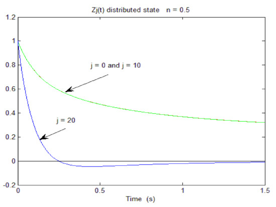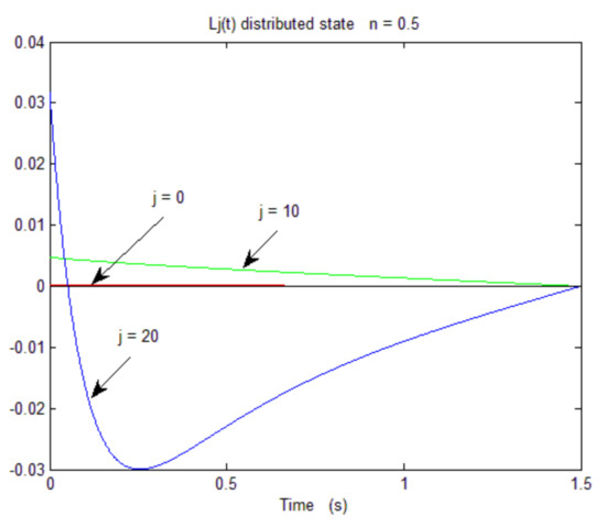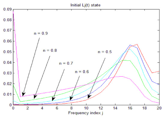 The initial values , computed by matrix inversion (Equation (82)), are displayed in Figure 5, for j varying from to , for the different values of . We can note in Figure 4 that the graphs of are initialized by the corresponding values of for .