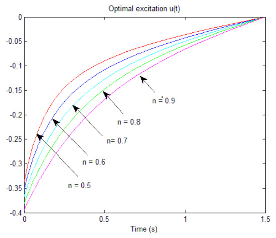 The optimal excitation is calculated for the system with different values of the fractional order as well as for the integer order case .