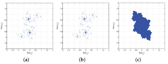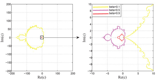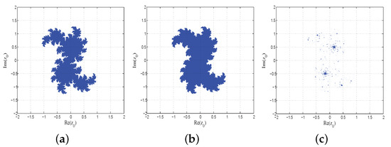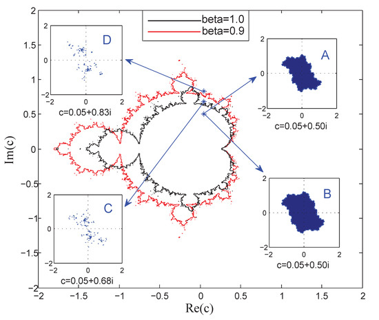 It should be noted that fractals and chaos are two basic branches in nonlinear science and, to some extent, are closely related to each other. Although the concept of fractal was given in 1975 [7], its basic principle was put forward as early as 1918, when Gaston Julia [8] firstly investigated a simple complex map . Aided by computer technology, Mandelbrot [7] visualized the parameter area where the connected Julia sets’ parameter c is located. In recent years, there has been much research surrounding the properties of M-J sets [9,10,11,12,13], effects of noise disturbance [14,15,16,17,18] and related applications [17,18,19,20,21,22]. Meanwhile, a few researchers have also focused on the special fractal sets generated from alternated complex maps, superior complex maps, hyper-complex systems, etc. In addition, fractional mathematics is closely related to chaos and fractals. Fractional systems are worth studying from the fractal perspective. In [23,24], researchers investigated the citation profiles of researchers in fractional calculus, and proposed that the application areas of fractional calculus contain the fractal concept. Based on the control theory and method, Wang [25,26,27] investigates the Julia sets of a fractional Lotka–Volterra model and realizes its state feedback control. In [28], the numerical simulation of a Boussinesq equation with different fractal dimension and fractional order is carried out. The results show that the correlation model is suitable for groundwater flow in fractured media.