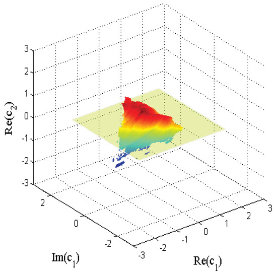 For a single system , can be plotted along two coordinates (). Further, in this study, the whole Connectivity Loci of an alternate superior system is defined as , which is determined by four coordinates (). With the help of the graphical method proposed in [2], this paper visualized its structure via software. At a certain resolution, fixing the to 0.3 and screening all which connect alternated superior Julia sets, we plotted the spatial- Connected Loci in Figure 3. Further, in Figure 4, Fixing the to 0, and we obtain the planar by recognizing the connectivity of the Julia sets corresponding to all . In a few words, Figure 4 is a slice of a three-dimensional and similar slices can be obtained by fixing any two dimensions.