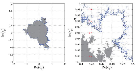 To verify the analysis mentioned above, our solution is putting the boundary of the cover on planar . From Figure 6, it can be seen in the location of that its superior Julia set is totally disconnected, the taken from area outside red boundary can lead to totally disconnected , the taken from gray area can lead to connected . For example, one can be set to (point in Figure 7); totally disconnected filled superior Julia set , totally disconnected filled superior Julia set and connected filled alternate superior Julia set are shown in Figure 8.