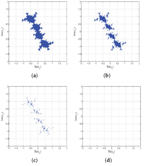 Based on the above definitions, system originates from the alternation of two single systems , and the superior Julia sets of have only two states, which are determined by the single critical point 0. The Julia sets which are plotted in Figure 2 indicate that the different connectivity relying on weather parameter c belong to the Mandelbrot set.