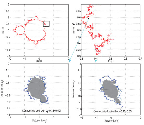 As is shown in Figure 5, the connectivity of four locations in Figure 4 is founded to vary along the Connected Loci, Disconnected Loci and Totally Disconnected Loci. That is, the gray area leads to connected superior Julia sets, the region between the grey boundary and blue line leads to disconnected superior Julia sets, the region outside the blue line gives rise to totally disconnected superior Julia sets.