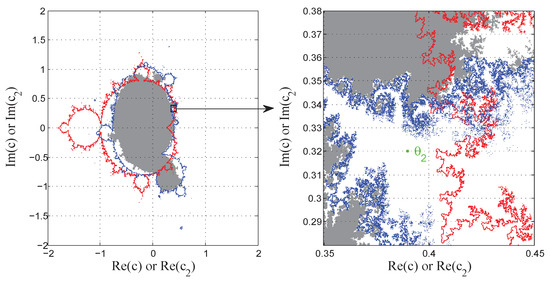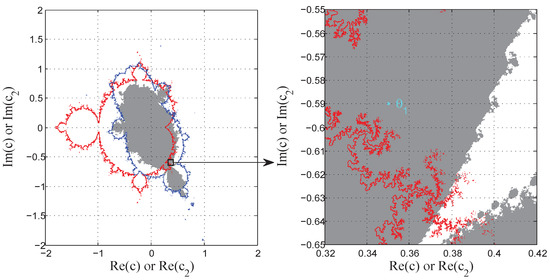 Now, the next step is to find a pair of parameters , which make individual superior Julia sets disconnected and alternate superior Julia sets connected. With the help of the relationship between the regions and the connectivity mentioned above, the which satisfies the phenomenon “disconnected+disconnected=connected” should be outside of the red boundary and inside the grey region.