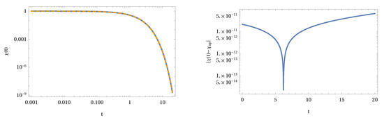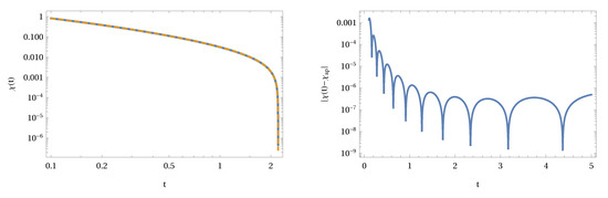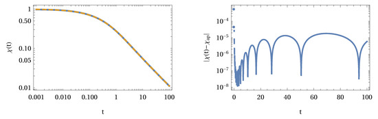 If ϕ denotes a one-to-one transformation of the interval onto the real line , let h denote a fixed positive number, and let the Sinc points be defined on by , , where denotes the inverse function of the conformal map ϕ. Let M and N be positive integers, set , and, for a given function f defined on , define the vector , and a diagonal matrix by . Let be the vector of basis functions, and let be a square Töplitz matrix of order m having , as its entry, ,Define square matrices and bywhere the superscript “T” denotes the transpose. Then, the indefinite integrals (34) and (35) are approximated byThe error of this approximation was estimated for the pure Sinc case in Reference [30] aswhere and are constants independent of N. Note the matrices
