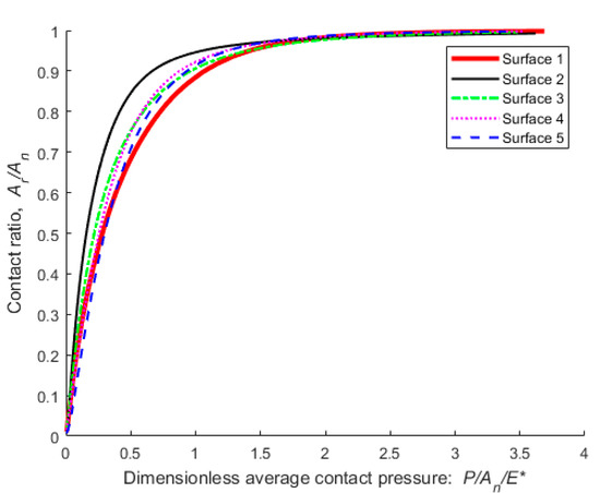 The predictions of the boundary element method (BEM) method for the contact area as a function of the average contact pressure of each surface are then compared. The real contact area, Ar (what is actually touching), is normalized by the nominal or apparent area, An. In this case, the nominal or apparent area, An, is the entire surface. The applied normal load is also normalized by the nominal or apparent area, An, and the effective elastic modulus, E*. If the results follow the theory mentioned previously, the predictions should collapse onto one curve when plotted this way. As shown in Figure 1, the real area of contact curves as a function of the normalized pressure do not collapse onto one curve. The five surfaces immediately start to diverge after the surfaces are put into contact and do not begin to converge until they reach a dimensionless contact pressure of 2, which is associated with over 90% of the surfaces in contact. Surface 2 had the strongest response as a function of the applied pressure and surface 1 and 5 had the weakest responses over different ranges. Although the differences may visually appear small, they are as large as 50% in some locations on the curves. Note also that surfaces 1 and 2 have relatively little agreement, even though they have nearly identical values of the RMS slope as well as the Nayak parameter, α, which in a recent work [52] was stated to be the two most important parameters governing rough surface contact. The differences in the results might be due to the anisotropic and random nature of real measured surfaces that preclude perfectly statistically Gaussian or fractal self-affine surfaces.