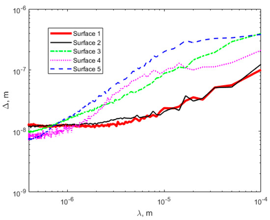 The differences might therefore be explained by how the structure of the surface changes as the scales are traversed. The spectrum of the surfaces is plotted in Figure 2 and Figure 3. A spectrum is a description of a signal’s (here a surface) amplitude at different harmonic scales, or wavelengths (frequency is the inverse of wavelength and defines the number of peaks per length). In this work, the spectrum was calculated using a fast Fourier transform. Here, the spectrums are plotted in two ways: first, the spectrums are plotted simply as the amplitude as a function of the wavelength (see Figure 2); next, they are plotted by normalizing the amplitudes of the Fourier series by the wavelength at each scale (see Figure 3). In previous literature, the aspect ratio (amplitude to wavelength ratio) has been assigned the symbol, B [17,53]. If B were constant across all scales, this indicates that a surface’s asperities (the peaks on a rough surface) have the same aspect ratio or shape across all scales. This structure would indicate a self-similar fractal surface. Figure 3 demonstrates that the normalized amplitude for each surface is divergent from each other for wavelengths exceeding 10−6 m and non-constant at all length scales. For most of the surfaces, the ratio B appears to increase as the scale (wavelength) decreases. Surface 5 does have a shoulder in the data spanning between the 300-nm and 10-µm wavelength, which you would expect in a self-similar structure.