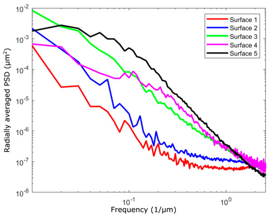 In addition, the power spectral density of each surface is calculated and plotted as shown in Figure 4. The complete original PSDs of each surface is plotted in Appendix A as well. Overall, all the PSDs are not isotropic (axisymmetric), but their radially average PSD is quite similar to the previous spectrum plots. From Figure 4 (also Figure 3), it is clear that surfaces 3–5 might be considered representative of self-affine rough surfaces, which follow a piece wise power law. Surfaces 1 and 2 are different, their high-frequency PSD is flattened, which is not as often observed. This might be the reason why the contact results of surfaces 1 and 2 significantly deviate from the rest of the surfaces. Additionally, the gap between the real contact area of surface 1 and 2 could be due to the difference of their PSD curves.