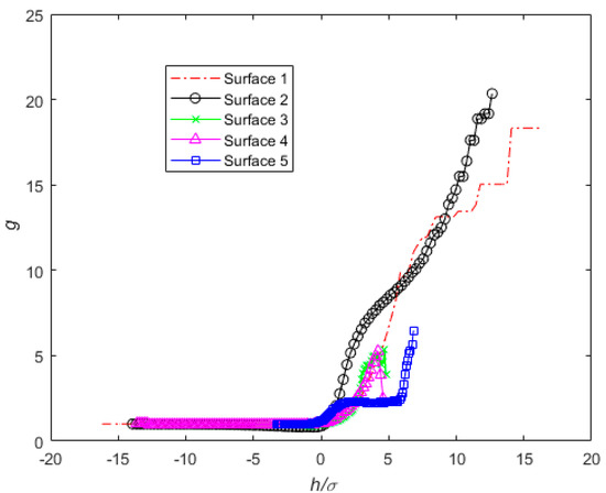 To further explore the potential link between variable RMS roughness and surface contact response, the RMS slope () is plotted as a function of the surface height in Figure 5. For a certain truncation height (h), only the portion of the surface taller than h is used to calculate the RMS slope (g). As shown in Figure 5, the RMS slope (g) varies based on the truncation height (h). Since only the taller peaks on the surface will be in contact at lighter loads and the rest of the surface will only move into contact as the load increases, it stands to reason that the RMS surface roughness will only be dependent upon the surface area currently in intimate contact. In this way, the RMS surface roughness will vary throughout the loading of a real surface. We can call the RMS slope of the contacting surface the effective RMS slope. The data in Figure 5 shows that the effective RMS slope will start at a higher value for lightly loaded contacts and decrease gradually until approaching the RMS slope of the entire surface for heavier loads as expected. The effective RMS slope appears to approach the RMS slope of the entire slope at an h value of approximately -σ or −2 σ, which is just after passing the mean height of the surface. The trends for each surface are complex, containing plateaus but are roughly monotonic. It is likely that this variation in the slope during loading is a direct cause of the disparity between the contact response of real imperfect surfaces and computational models, and is a result of these natural surfaces’ lack of perfectly self-affine features.