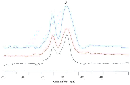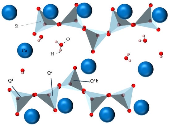 Silicate anion is the basic unit of C-S-H gel. In the structure of silicate anion, the tetrahedral units [SiO4] are linked together by sharing oxygen atoms to form Si–O–Si bonds. Understanding the coordination of silicate anions is of great significance for the establishment of the C-S-H model. NMR is a powerful characterization method and provides valuable information for the structural analysis of silicate anions. Zanni et al. applied NMR to the detection of C-S-H structure, 29Si NMR gave the information of C-S-H with silicon-oxygen tetrahedron structure, 1H NMR distinguished the H element connected with silicon atom or calcium atom, and 43Ca NMR determined the location of calcium atom in the structure [73]. The location of the peak varied with the amount of bridging oxygen in a specific [SiO4] unit. The [SiO4] units can be classified by the position of the peaks in the spectrum as measured by 29Si NMR. Theoretically, five types of Qn sites could be found, whose chemical displacement was Q0 (−70 ppm), Q1 (−80 ppm), Q2 (−88 ppm), Q3 (−98 ppm) and Q4 (−110 ppm) [74]. From 29Si MAS-NMR test spectrum, the C-S-H in the silicate chains was linear, Q0, Q1 and Q2 were single silicon-oxygen tetrahedron (not connected to other silicon-oxygen tetrahedron), the end of the chain tetrahedron (only with a silicon oxygen tetrahedron) and central chain tetrahedron (connected to the two silicon-oxygen tetrahedron) in silicon oxygen tetrahedron, respectively. Figure 1 shows the position of the Si element in the C-S-H gel. Figure 2 shows the MAS-NMR spectrum of 29Si. Silicon sites of Q1 and Q2 were dominant, Q3 and Q4 did not exist, Q0 appeared in small amounts (representing the unhydrated clinker) [75]. Gautham et al. obtained the distribution information of silicon elements in C-S-H by NMR [76]. The test results showed that Q0 ≈ 10%, Q1 ≈ 67% and Q2 ≈ 23% in C-S-H. Due to the interaction between silicate anions and Ca cations, the change in the Ca/Si ratio would lead to significant changes in silicate structure [77]. The analysis results of C-S-H samples with multiple Ca/Si ratios using X-ray photoelectron spectroscopy [78] and 29Si NMR [79] showed that when the Ca/Si ratio remained unchanged, the average chain length increased with the hydration time. In addition, increasing the Ca/Si ratio will lead to a decrease in the polymerization degree of silicate chains. The depolymerization of Ca atoms is an important feature in the study of C-S-H skeleton structure.