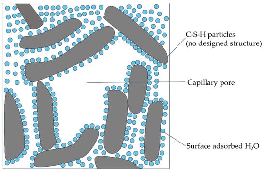 In the Munich model (as illustrated in Figure 4), C-S-H gel is a three-dimensional network composed of amorphous colloidal gel particles (or say dry gels), which are bound together by van der Waals forces but still dominated by strong ionic covalent bonds [84]. Through results from a series of adsorption measurements, the role of water between the particles is emphasized in the model. It is explained that the creep is responsible for the weakening of bonds among C-S-H particles, rather than by the interlaminar binding force. Such a model well explains the behavior of hardened cement paste under different humidity conditions. Compared with the Feldman–Sereda model, the separation pressure in this model is assumed to occur in the high humidity region of the isotherm. Therefore, the model fails to reveal the phenomenon of creep or dry shrinkage under loading attributed to the change in C-S-H nano-pore. Similar to the Feldman–Sereda model, the model suggests that water vapor should interact with the C-S-H structure, making this model unsuitable for surface area measurements.