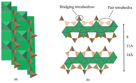 Molecular structure models of tobermorite [86,88]. (a): The top view of the silicate chain connected to the calcium sheet in tobermorite structure; (b): The side view of the double-layered tobermorite structure without in-terlaminar water molecules and interlaminar calcium ions.
