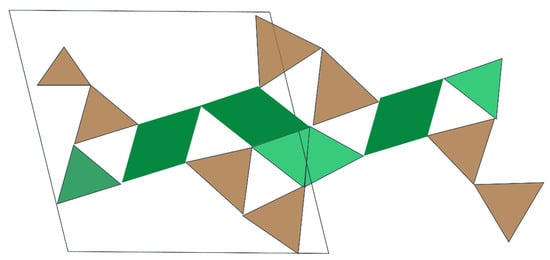 The tobermorite and jennite are both natural silicate minerals. The top view of the silicate chain connected to the calcium sheet in tobermorite structure is shown in Figure 5a. The side view of the double-layered tobermorite structure without interlaminar water molecules and interlaminar calcium ions is shown in Figure 5b. The top and bottom of the tobermorite silicate chain are connected to calcium, and the repeating units of the silicate chain contain at least three [SiO4] tetrahedral units. Two tetrahedrons that share the oxygen in dome-shaped mode are called “paired tetrahedrons”. The parasilicon-oxygen tetrahedron in both crystals locates on the main calc-oxygen layer, while the bridged silicon-oxygen tetrahedron connects the adjacent parasilicon-oxygen tetrahedron dimers, increasing the molecular chain length of the chain of Si-O. The Ca/Si ratio of jennite crystal is higher than that of tobermorite crystal, and there are Ca-OH groups on the main layer. According to different layer spacings, tobermorite crystal is referred to as 9, 11 and 14 Å mineral [85]. Tobermorite minerals have different interlamellar spacings, which usually contain water molecules and calcium ions (or other cations) [86]. Tobermorite of 11 and 14 Å are proved to be monoclinal crystals, while 9 Å tobermorite and jennite are triclinic crystal structure [87]. Jennite (as illustrated in Figure 6) is another crystalline mineral whose structure has a high similarity to the structure of C-S-H gel.