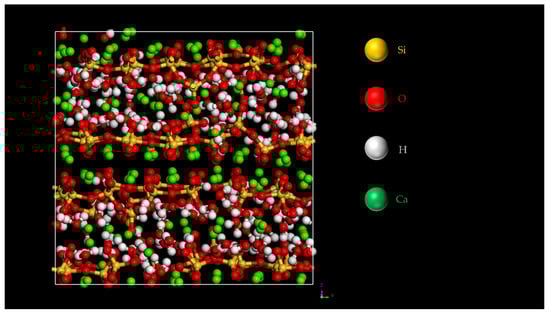 Bauchy et al. used molecular dynamics to simulate the fracture toughness of C-S-H at the atomic dimension [157], and the results showed that at this dimension, the fracture of C-S-H was manifested as a ductile fracture. Shahsavari et al. evaluated the mechanical properties of C-S-H with different crystal structures by using the first principle based on the structure of tobermorite and jennite [86]. The investigated class of materials and results are relevant to chemically complex hydrated oxides, such as layered C-S-H, the binding phase of all concrete materials and the principle source of their strength and stiffness. Zhang et al. made use of the CSH-FF force field and found that the strength and fracture toughness of C-S-H increased after CH entered the C-S-H layer, which was caused by the strong hydrogen bond formed between CH and C-S-H [158]. Hou et al. established a hierarchical C-S-H model at the molecular level based on the crystal structure of tobermorite. Through the molecular dynamics calculation, it was found that the E of C-S-H was about 40–50 GPa in X and Y directions and about 25 GPa in the Z direction under uniaxial tensile load [159]. Manzano et al. studied the mechanical properties of C-S-H through lattice dynamics simulation. The results showed that the volume, shear stress and elastic modulus of C-S-H decreased slightly with the increase in Ca/Si ratio, and the decrease trend was obvious with the increase in the ratio of H2O/Ca [160]. Through the molecular dynamics simulation, Qomi et al. found that there was a significant decrease in the average indentation modulus with increasing Ca/Si ratio [161]. It is not surprising that as Ca/Si ratio increases the calcium-silicate layers become defective, and as a consequence, mechanical stiffness and anisotropy decrease. A similar trend is found for the hardness H.
