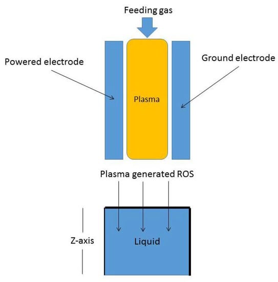 The interaction between CAPs and biological targets in most cases involves plasma–liquid interaction. Therefore, this interaction is very important in plasma medicine and has been studied by many researchers to understand the behavior of plasma-generated reactive species above and in the liquid, where CAPs can be generated in the top surface of the water, an outer surface of a gas bubble, or even an aerosol droplet in the gas phase. The plasma-generated reactive species can interact with the water surface and generate more reactive species, or they can be diffused directly into the water and hence react with components in the aqueous phase, which makes the plasma-treated water enriched with chemical reactions, and this can be utilized in many biological applications [4,9]. For example, Blackert et al. reported in their work [10], using a dielectric barrier discharge (DBD) plasma source in air and above the liquid surface, that ROS in the plasma/gas phase could be transferred to the liquid and react with components in the aqueous phase. H2O2, as one of the most important plasma-generated reactive species, was reported to be produced by an argon-based radio frequency plasma jet and then diffused to the aqueous phase [11]. Moreover Wende et al. reported that plasma-generated atomic oxygen can initiate chemical reactions in a standard physiological buffer or liquid via reactions with chloride, yielding Cl2− or ClO−. Gorbanev et al. [12] reported that, by using isotopes, H2O2, O2−, OH, OOH, and H species in the plasma-treated liquid originate from the gas phase. Lukes et al. also evidenced the generation of some ROS like ONOOH, NO2, NO, and OH radicals and NO+ by the air plasma at the gas–liquid interface because of post-discharge processes in plasma-activated liquid [13]. The plasma-generated reactive species can affect many biological targets directly (direct exposure to CAPs) or indirectly through plasma-activated liquid (PAL), where they have a prolonged effect on biological targets ranging from minutes and can reach several days after treatment with plasma [4,14,15,16,17].