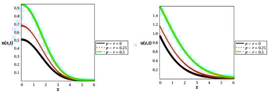 In Figure 2, we illustrate the spatial distribution of the reactive species for different values of relaxation time along the z axis for the normal diffusive (left panel) and for the sub-diffusive case (right panel). In Figure 2 we show that changing the value of relaxation time implies the speed of propagation in the case of a symmetrical Gaussian distribution at in the left panel and a more shifted non-Gaussian (asymmetrical) distribution with a lower value of time-fractional order (right panel). In addition to that, as a limiting case of study, the solution of the reaction–diffusion equation is illustrated in Figure 2 (black curve at ) for the classical case (left panel) and the fractional case (right panel).