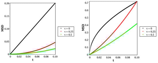MSD in the case of (left panel) and (right panel) with different values of relaxation time at .