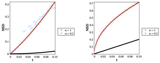 MSD in the case of (left panel) and (right panel) for different values of the time fractional order at .