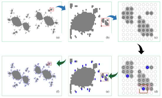 The flowchart of the proposed algorithm in which (a,b): corresponding to the steps (I), (II). (c,d): corresponding to the steps (III), (IV). (e,f): corresponding to the step (V).