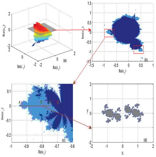 (a) The spatial with ( is the imaginary part). (b) The slice of with ( is the real part). (c) The local enlarged region of (b). (d) The filled Julia set with B point parameter .